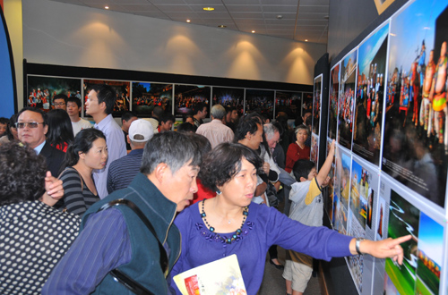 演出前,“文化中國(guó)•四海同春”大洋洲藝術(shù)團(tuán)團(tuán)長(zhǎng)、國(guó)務(wù)院僑辦副主任趙陽(yáng)在劇場(chǎng)外大廳為《中華民族全家!穲D片展剪彩。一幅幅圖片展示著中國(guó)56個(gè)民族多姿多彩的文化生活;匠莾S胞們或駐足欣賞,或興奮地向周邊朋友細(xì)說(shuō)自己在中國(guó)的所見(jiàn)所聞。
