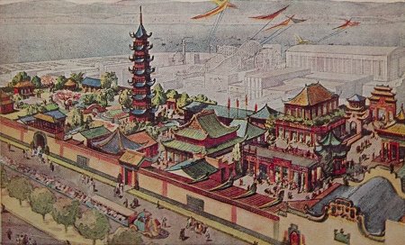根據(jù)有關(guān)資料,“中國村”入口大門是一座巨大的牌坊,上面書寫著“華商展覽場”幾個(gè)大字!爸袊濉眱(nèi)設(shè)有兩個(gè)酒家、兩座戲院、一座神廟和一座七層高的佛塔!胺鹚侵袊鍍(nèi)最高建筑!眴涛陌步榻B,“中國村”內(nèi)還建了一個(gè)陳列館和一二十家商店,分別展出中國的各類民間工藝品、瓷器、茶葉,還有少量具備科技含量的產(chǎn)品。