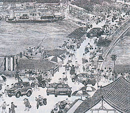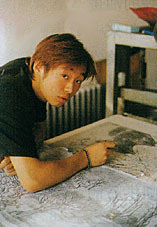 楊曉剛,湖南長沙人,從小熱愛藝術(shù),97年考入中央美術(shù)學(xué)院版畫系,四年至今,如其周圍的許多同學(xué)一樣安心學(xué)習(xí)、踏實(shí)創(chuàng)作。然而藝術(shù)學(xué)院的生活遠(yuǎn)非想像中的繽紛多彩,大多數(shù)的時間是充斥著一成不變帶來的無聊寂寞與因才思枯竭而導(dǎo)致的痛苦失落。四年以來他一直在努力地尋找著自身的藝術(shù)語言,1999年由諾基亞公司投資主辦的「我看未來」國際藝術(shù)大賽,《清明上河圖》(之十九)獲得金獎,而其藝術(shù)作品也逐漸得到了圈內(nèi)及社會有關(guān)人士的關(guān)注和認(rèn)同,曾入選到全國版畫展、全國高等院校版畫年會等重要的展覽中,中央美術(shù)學(xué)院陳列館、一些畫廊及私人收藏家都開始收藏他的作品。談及這件仍未完成的作品創(chuàng)作目的時,他坦言:「起初也沒有大的構(gòu)想,只想趁著比賽的機(jī)會把自己多年的想法試著實(shí)現(xiàn)。我覺得周星馳能用電影語言把這個時代展現(xiàn)得淋漓盡致,而他那種后現(xiàn)代解構(gòu)經(jīng)典的方式我更為欣賞,所以我嘗試著利用二維平面的繪畫語言表達(dá)我對當(dāng)下文化情境的理解和看法!怪劣谶x擇《清明上河圖》為「破」的對象,原因不言自明。見過或熟悉此鴻篇巨制的人們都幾乎認(rèn)定它是宋世風(fēng)情的完美再現(xiàn),更是家喻戶曉的中國傳統(tǒng)繪畫經(jīng)典之一。以此為原型解構(gòu)和重新建構(gòu),不僅可以實(shí)現(xiàn)作者力圖展現(xiàn)當(dāng)代現(xiàn)世百態(tài)的初衷,還可以在觀者對原作的整體把握(其實(shí)是建立在相當(dāng)不明確的概念化、經(jīng)驗化的理解之上的)和對畫面細(xì)節(jié)的陌生記憶、以及畫家有意識的內(nèi)容變動而產(chǎn)生的不協(xié)調(diào)感,這三者的視覺矛盾中引發(fā)一系列新的沖突與意義,從而給長時間的艱苦繪制過程不斷地帶來新鮮和奇跡。