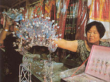 丁愛華老師是久春的?椭,每次來都是為她和票友朋友們自己組織的業(yè)余劇團采購行頭,這次她打算買幾個釵頭,再買一頂鳳冠。一看劉大媽拿出來的兩頂鳳冠,丁老師就有點拿不定主意了,兩頂鳳冠一樣漂亮,一樣華麗,但是造型風(fēng)格又略有不同,比來比去,不一會兒就挑花了眼。