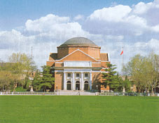 二校門往里,穿過林陰道,前面豁然便是一方綠色的大草坪。草坪那端,穩(wěn)穩(wěn)當(dāng)當(dāng)端端正正坐落著的是巍峨的大禮堂:泛著銅綠的圓頂、紅色敦實(shí)的墻身,四根漢白玉大石柱撐起的白色門廊以及泛著金光的大銅門。在藍(lán)天綠草之間,大禮堂給人一種不屈不撓,雄渾踏實(shí)的感覺。它是清華園的標(biāo)志,也是長(zhǎng)期以來清華師生認(rèn)為是清華人性格的象徵。而位于大草坪正南端,1920級(jí)校友贈(zèng)送的日昝上刻著的「行勝于言」,也將清華師生這種樸實(shí)進(jìn)取的性格特徵表露無遺。