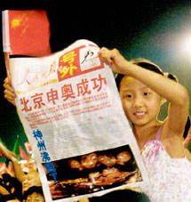 天安門廣場慶祝申奧成功一位女孩高舉"號外"與家人一起在天安門廣場慶祝申奧成功。 |