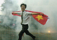 一名中國青年高舉五星紅旗,冒雨在中國駐莫斯科大使館鳴放的鞭炮煙火中狂奔,歡呼北京申辦奧運會成功。 |