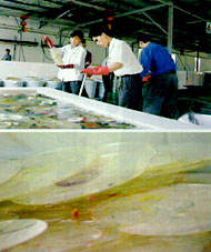 日前,一種數(shù)字光盤脫落環(huán)保銷毀技術(shù)在深圳市研究成功,為銷毀盜版光盤尋找到了一條新的途徑。以前采用的壓碎、焚燒、填埋等污染環(huán)境的方式將被取代。上圖為工作人員在銷毀池。下圖為處理過的光盤。 |