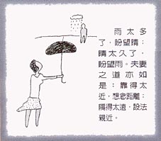 雨太多了,盼望晴;晴太久了,盼望雨。夫妻之道亦如是:靠得太近,想念距離;隔得太遠(yuǎn),設(shè)法親近。