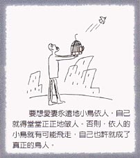 要想愛妻永遠(yuǎn)地小鳥依人,自己就得堂堂正正地做人。否則,依人的小鳥就有可能飛走,自己也許就成了真正的鳥人。