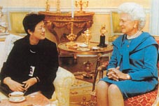 章含之的坦率與天真,使她廣交朋友(圖右為老布什夫人芭芭拉)。 |