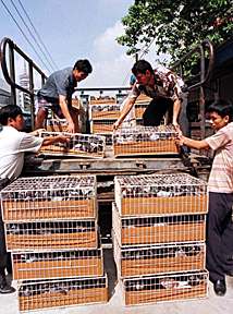 廣州舉行“信鴿競(jìng)翔報(bào)歸訊”活動(dòng) 作者:李懷德 象征1999年的1999只信鴿將于九月九日在澳門的大三巴牌坊前放飛返回廣州。這項(xiàng)名為“信鴿競(jìng)翔報(bào)歸訊”的活動(dòng),將揭開九月十一日澳門回歸祖國(guó)倒計(jì)時(shí)一百天紀(jì)念活動(dòng)的序幕。圖為廣州市信鴿協(xié)會(huì)正將征集的信鴿運(yùn)往澳門。 |