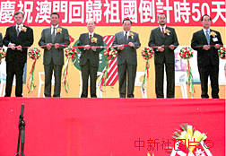 澳門各界三十一日在澳門友誼廣場(chǎng)舉行慶祝澳門回歸倒計(jì)時(shí)五十天活動(dòng),全國政協(xié)副主席、澳門各界慶;貧w活動(dòng)委員會(huì)主席團(tuán)主席馬萬祺(左三)、澳門特別行政區(qū)首任行政長官何厚鏵(左二)、新華社澳門分社社長王啟人(左四)等嘉賓為慶;顒(dòng)剪彩。