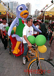 在澳門回歸倒計時五十天慶祝活動中,具有澳門當?shù)靥厣娜嗆囕d著吉祥物卡通"回歸燕" 首次與公眾見面。