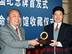 由香港著名設(shè)計師宣小英設(shè)計的"澳門回歸紀念牌",三日在北京由發(fā)行單位中國安徽國際經(jīng)濟技術(shù)合作公司將"0001"號捐獻給中國革命博物館作永久收藏。