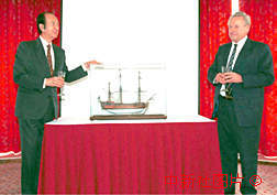 瑞典駐港領事祈榮富先生(右)九日在澳門將一艘十八世紀商船模型贈送給澳門旅笴娛樂有限公司董事總經(jīng)理何鴻(上焱下木)博士。這艘名為“高登堡”號的商船隸屬瑞典東印度公司,曾於一七三二年至一八零六年三度來華貿(mào)易,并停泊澳門。