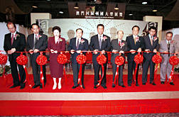 澳門回歸祖國大型展覽十一日在澳門開幕,澳門特區(qū)首任行政長(zhǎng)官何厚鏵、新華社澳門分社社長(zhǎng)王啟人、澳門中華總商會(huì)會(huì)長(zhǎng)馬萬祺等嘉賓為展覽剪彩。