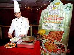 為慶祝澳門回歸祖國,香港新光酒樓將於十二月一日舉辦盛大的"慶回歸澳門美食節(jié)",以澳葡菜為主筵開六十多席,圖為澳門木偶餐廳的大廚推介富有特色的"薯絲馬介休"美食。