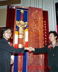 為慶祝澳門回歸祖國,河南省旅游局與登封市人民政府將一柄制作精良、重五十斤的特大型少林寶劍贈送給澳門人民。圖為河南省旅游局副局長方洪蓮(右)向澳門政府旅游司代司長文綺華贈送寶劍。