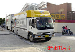 參加澳門回歸報(bào)導(dǎo)的現(xiàn)場(chǎng)電視轉(zhuǎn)播車七日陸續(xù)抵達(dá)澳門。 中新社傳真 毛建軍 攝