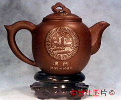 上海桃林藝術(shù)有限公司八日隆重推出紫砂《澳門回歸壺》,該壺選用極品紫砂歷時一年半精制而成,整壺采用24K純金銀絲鑲嵌。造型像一羽橢圓形和平鴿,意喻澳門平穩(wěn)過渡,飛向新世紀(jì);壺滴為吉祥云,象征著澳門半島。作者:潘索菲