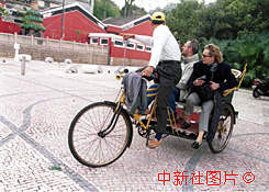 許多外國游客回歸前親臨澳門,乘坐獨特的人力三輪車觀賞葡萄牙當(dāng)年登上澳門的媽閣廟。中新社傳真