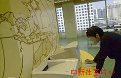 澳門(mén)回歸前夕,新聞中心展開(kāi)新聞大戰(zhàn),香港記者在世界地圖前發(fā)稿。中新社傳真 王瑤攝