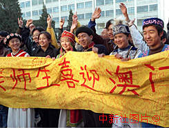 北京中央民族大學(xué)的師生們十日上午在校園內(nèi)用各民族文字書寫喜迎澳門回歸橫幅,迎接這一大喜日子的到來(lái)。
