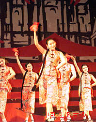 喜迎澳門回歸歌舞音樂會(huì)十四日在北京人民大會(huì)堂舉行。圖為陳愛蓮藝術(shù)團(tuán)的演員在表演舞蹈《大姑娘美》。