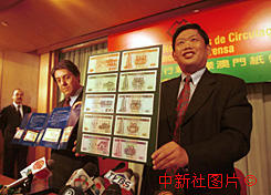 中國銀行澳門分行總經(jīng)理朱赤先生十五日在澳門舉行的記者招待會上,展示將于回歸之日發(fā)行的新版澳門元鈔票。 中新社傳真 毛建軍攝
