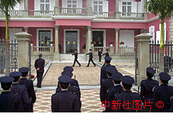 16日上午,在蒙蒙細(xì)雨中的澳督府門(mén)前舉行降旗演練儀式。