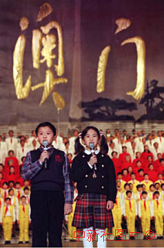 澳門小歌手陸勁東、陳芷華在北京加緊排練,準備二十日晚在北京首都體育館舉行的慶祝澳門回歸晚會上演出。