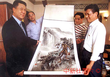 北京著名畫家李廣利(右一)近期在北京向澳門特區(qū)行政長(zhǎng)官何厚鏵(左一)贈(zèng)送了一幅國(guó)畫《大展雄風(fēng)》,以表示他對(duì)澳門的美好祝愿。