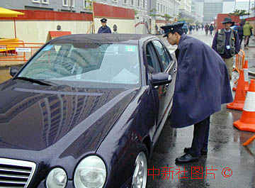 澳門警察十八日冒雨在政權(quán)交接場地周圍檢查車輛,疏導(dǎo)交通。中新社數(shù)碼傳真