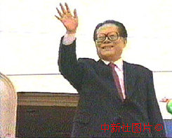 中國(guó)國(guó)家主席江澤民今天中午十二時(shí)許乘專機(jī)抵達(dá)澳門,步出機(jī)艙的一瞬向歡迎的人群招手致意。中新社傳真