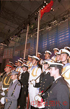 參加澳門政權(quán)交接儀式的中國(guó)人民解放軍與葡萄牙軍隊(duì)的儀仗隊(duì)官兵們,共同在中國(guó)五星紅旗下合影留念。中新社傳真 毛建軍攝