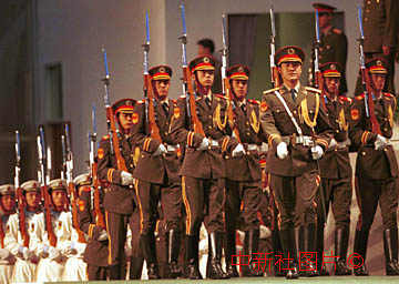 中國人民解放軍三軍儀仗隊進入澳門政權(quán)交接大廳,執(zhí)行盛典禮儀。中新社傳真 毛建軍攝