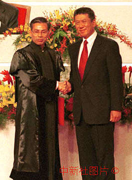 澳門特區(qū)檢察院檢察長向澳門特別行政區(qū)首任行政長官何厚鏵宣誓就職。中新社傳真 洪少葵攝