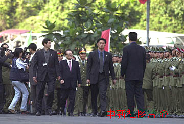 國(guó)家主席江澤民二十日在澳門參加回歸慶典中,來到剛剛進(jìn)駐澳門鬧市里的解放軍軍營(yíng),檢閱未洗征塵的三軍將士! ≈行律鐢(shù)碼傳真 毛建軍 攝