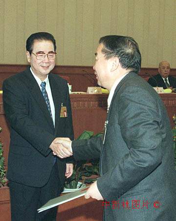 李鵬委員長二十日下午向全國人民代表大會常務(wù)委員會澳門特別行政區(qū)基本法委員會組成人員喬曉陽等十人頒發(fā)任命書。圖為喬曉陽主任接受任命書。作者:任海霞