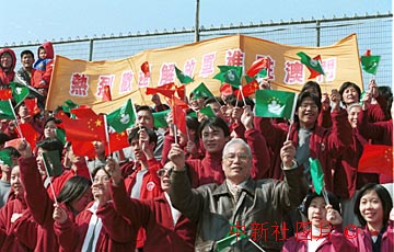 澳門各界人士二十日中午紛紛涌向街頭,高舉橫幅歡迎中國人民解放軍駐澳部隊(duì)。中新社傳真 李剛攝