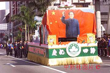 澳門回歸之日在鬧市舉行盛大的“邁向美好明天"大巡游中,國家主席江澤民揮手形象的花車最引人注目。中新社數(shù)碼傳真 宗金柱攝
