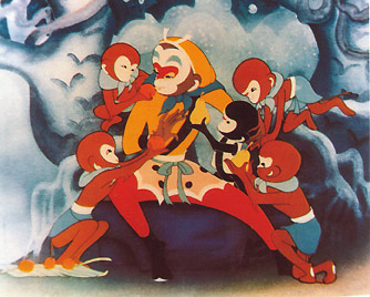 在花果山帶領(lǐng)群猴操練武藝的猴王因無稱心的武器,便去東海龍宮借寶。龍王許諾,如果猴王能拿動龍宮的定海神針--如意金箍棒,就奉送給他。但當(dāng)猴王拔走寶物之后,龍王又反悔,并去天宮告狀。玉帝采納了太白金星的主張,誘騙猴王上天,封他為弼馬溫,將他軟禁起來。猴王知道受騙后,一怒之下,返回花果山,豎起"齊天大圣"的旗幟,與天宮分庭抗禮。玉帝發(fā)怒,命李天王率天兵天將捉拿猴王,結(jié)果被猴王打得大敗而歸。玉帝又接受金星的獻(xiàn)策,假意封猴王為"齊天大圣",命他在天宮掌管蟠桃園。一日,猴王得知王母娘娘設(shè)蟠桃宴,請了各路神仙,唯獨(dú)沒有請他。猴王火冒三丈,大鬧瑤池,打得杯盤狼藉,他獨(dú)自開懷痛飲,又吃了太上老君的九轉(zhuǎn)金丹,收羅了所有酒菜瓜果,回花果山與眾猴擺開了神仙酒會。玉帝暴怒,傾天宮之兵將,捉拿猴王。交戰(zhàn)中猴王中了太上老君的暗算,不幸被擒。老君將他送進(jìn)煉丹爐,結(jié)果不但沒有燒死,反使猴王更加神力無比。于是猴王奮起反擊,把天宮打得落花流水,嚇得玉帝狼狽逃跑。