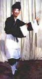 短衣類 一、茶衣:是用藍(lán)布做的裝身的短褶子。除兒童穿用外,更多的是一些酒保、樵夫、漁夫等穿著。茶衣的色彩較單調(diào)。 茶衣的式樣分兩種:一種是,斜領(lǐng)、大襟;別一種是,對襟。茶衣有的帶水袖,有的不帶水袖。 例如藍(lán)布大袖就是戲曲舞臺上扮演勞動人民或店家、酒保、群眾演員的服裝。穿用人物有《武松打虎》中的酒保、《問樵鬧府》中的樵夫、《挑廉戴衣》中的武大郎等。 彩旦褂子是戲曲舞臺上扮演丑婆、媒婆、巫婆、禁婆等角色穿的服裝。彩旦褂子本是清代漢人的生活服裝,這是中國服裝史上最不美觀的一種服裝造型。在舞臺上凡扮演比較丑的婦女形象,都穿這種彩旦褂子。 二、女式的褲子、襖:一般是小戶人家的年輕婦女或是大戶人家的丫環(huán)穿用,偶有大戶人家的、性格活潑、伶俐的姑娘穿用時,下身多數(shù)要罩一條裙子。襖的式樣是:立領(lǐng)、大襟、袖口較肥,不帶水袖。褲、襖的花色很多,因人而異,但有一種用紅布做成的褲、襖較為特殊,這樣的服裝專業(yè)用名是:罪衣、罪褲,是專門給犯罪的人穿的,其式樣與一般褲襖也有所不同:小領(lǐng)、對襟,腰里還著素白色的罪裙。下面再仔細(xì)介紹一下: 這是戲曲舞臺上扮演民間少婦、小家閨秀、小姐及丫鬟使女常用的服裝。襖、褲、裙在地方戲中,尤其評劇使用最多。襖、褲、裙的色彩除了不準(zhǔn)用明黃、杏黃色外,其他任何色彩都可使用,主要以繡花草為主。 穿用人物有《花田八錯》中的春蘭和《坐樓殺惜》中的閻惜姣等。 三、緊身衣:是便于武打穿用的一種緊身衣服,分為抱衣抱褲、打衣打褲、侉衣侉褲(快衣快褲)。 抱衣抱褲:戲曲舞臺上扮演非正式武將、武士的服裝, 老年武士的抱衣褲特點(diǎn)是色調(diào)沉著,不繡彩色圖案。穿用人物有《打漁殺家》中的蕭恩。而且穿香色抱衣的角色以《打漁殺家》中的蕭恩最具代表。 打衣打褲:這是戲曲舞臺上扮演女武俠、女兵、女將或神話劇中女妖的武打服裝(又稱戰(zhàn)襖戰(zhàn)褲戰(zhàn)裙),是藝術(shù)家王瑤卿(梅蘭芳之師)為《十三妹》專門設(shè)計的服裝。后為女兵、女將等通用。式樣為:小領(lǐng)、對襟、緊袖、有繡花。下身穿打褲、腰系戰(zhàn)裙。色彩沒有嚴(yán)格限制。高質(zhì)量的戰(zhàn)裙、襖為主要演員扮演主要角色穿用,質(zhì)量較差的為女兵所用。 穿用人物有《十三妹》(又稱《能仁寺》)中的女武俠十三妹。由于《十三妹》是一出唱、做并重的重頭戲,所以十三妹的扮相主要穿紅色戰(zhàn)裙、襖、褲與風(fēng)帽、彈囊。 快衣快褲(挎衣挎褲):武丑大部分穿這樣的衣服,武生也有穿的。如俠客、義士為了夜間行走不易暴露目標(biāo)穿挎衣,所以又稱為"夜行衣"。在特殊情況下官方武士也穿用。如《蘆花蕩》中張飛(扮作漁夫,埋伏在江邊,等候劉備回荊州時即穿挎衣)、"水滸"戲中的武松、石秀等武士也常穿此服裝?嬉率綐邮切☆I(lǐng)、對襟、緊袖。一般沒有繡花。顏色為純黑,只是袖子的底側(cè),胸部的正中,密排著白色的扣絆兒。 四、馬褂:在明代以前的生活服裝資料中,還未發(fā)現(xiàn)有關(guān)馬褂的資料。到了清代,生活服裝中已有馬褂。朝廷中以獎賞"御賜黃馬褂"為最高榮譽(yù)。但受獎的功臣們只有當(dāng)國家舉行大典時才能穿一次,平時則要高高供奉在祖宗堂上,以示榮耀。不過,他們可以復(fù)制一件較原物簡單的黃馬褂,以備公務(wù)需要時穿用。功勛大臣們違背皇規(guī)或犯錯誤時,皇帝還要將黃馬褂收回,以示懲罰。清代的一般文武官員都可以穿馬褂,只是不能用明黃、杏黃兩色。 在戲曲舞臺上,無論文官武將都可以穿馬褂,如唐代的薛平貴、宋代的金兀術(shù)以及《打嚴(yán)嵩》中的中軍、衛(wèi)士等都穿馬褂,這雖然與歷史上的生活服裝不相符合,但戲曲服裝自成體系,可不受歷史年代的限制。 舞臺上馬褂的式樣與解放前的那種長袍外邊套的馬褂差不多,只是多繡了一些花。它經(jīng)常是套在箭衣外邊,作為一種行路的外罩服裝,也可以作為戰(zhàn)斗時穿的服裝。 五、彩褲和水衣。是每個演員必穿的,彩褲有各種顏色。水衣是襯在服裝里的粗布襯衣,因為戲典服裝是價格較為昂貴的一種工藝品,所以里面穿些衣服,盡是減少演員的汗水對戲裝的污損。